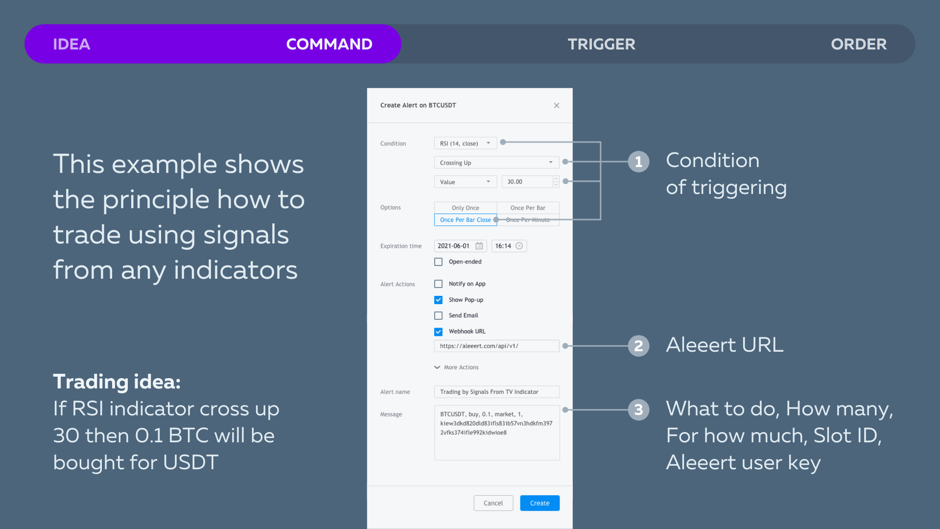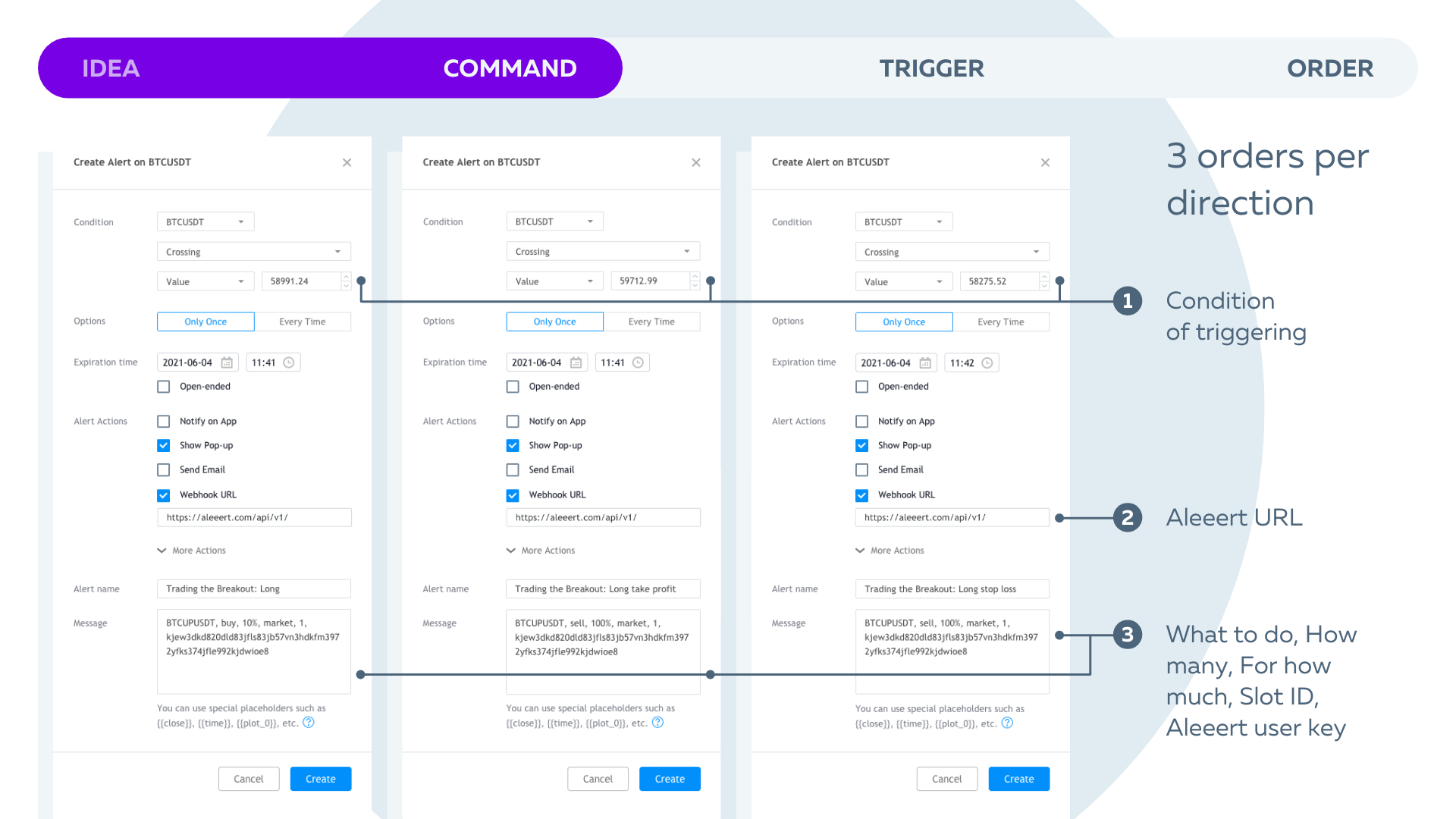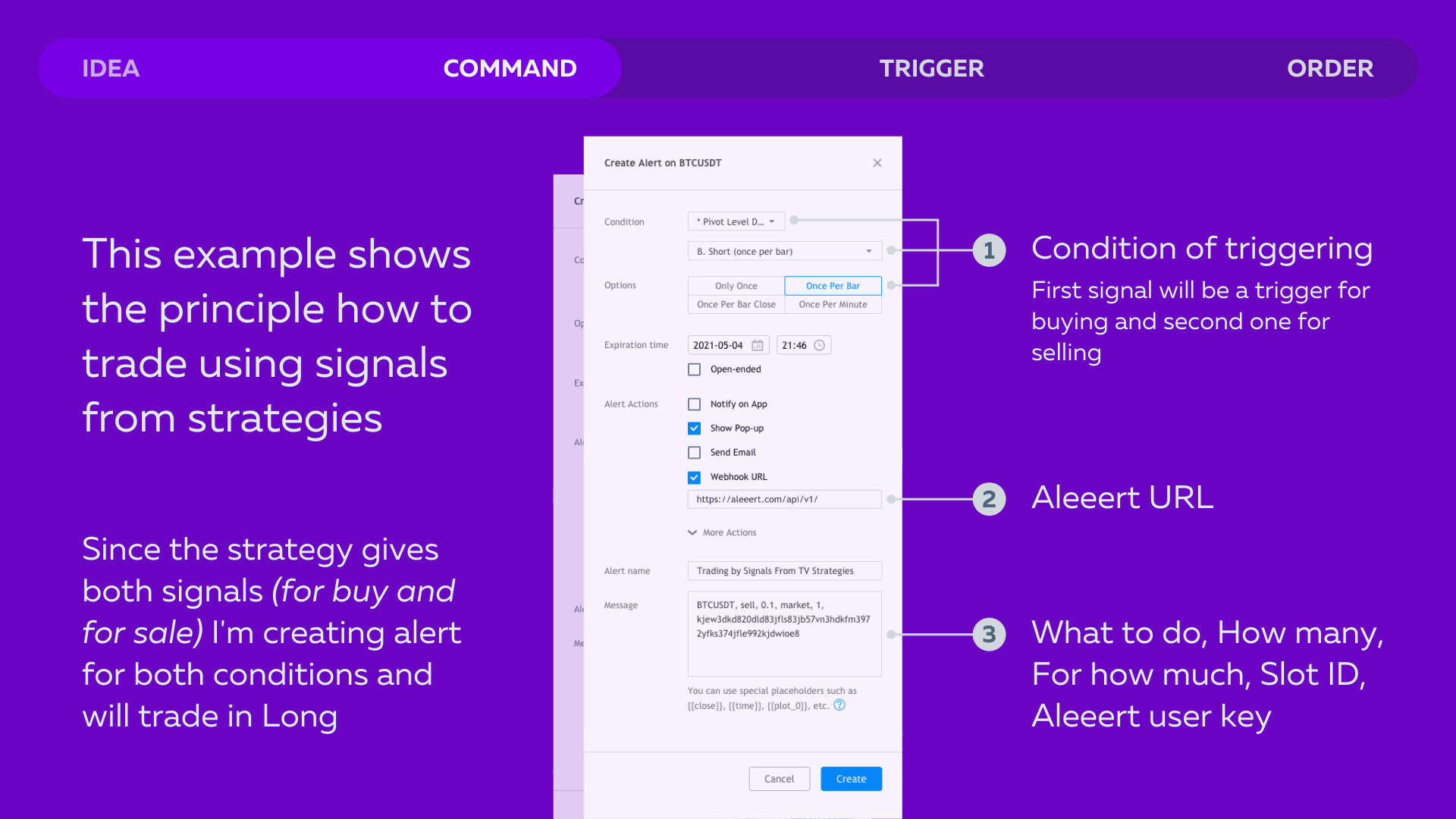 The trading command is a text string with several parameters. Using this command, the trader places and manages orders. This command must be used in the message area when creating alerts in TradingView